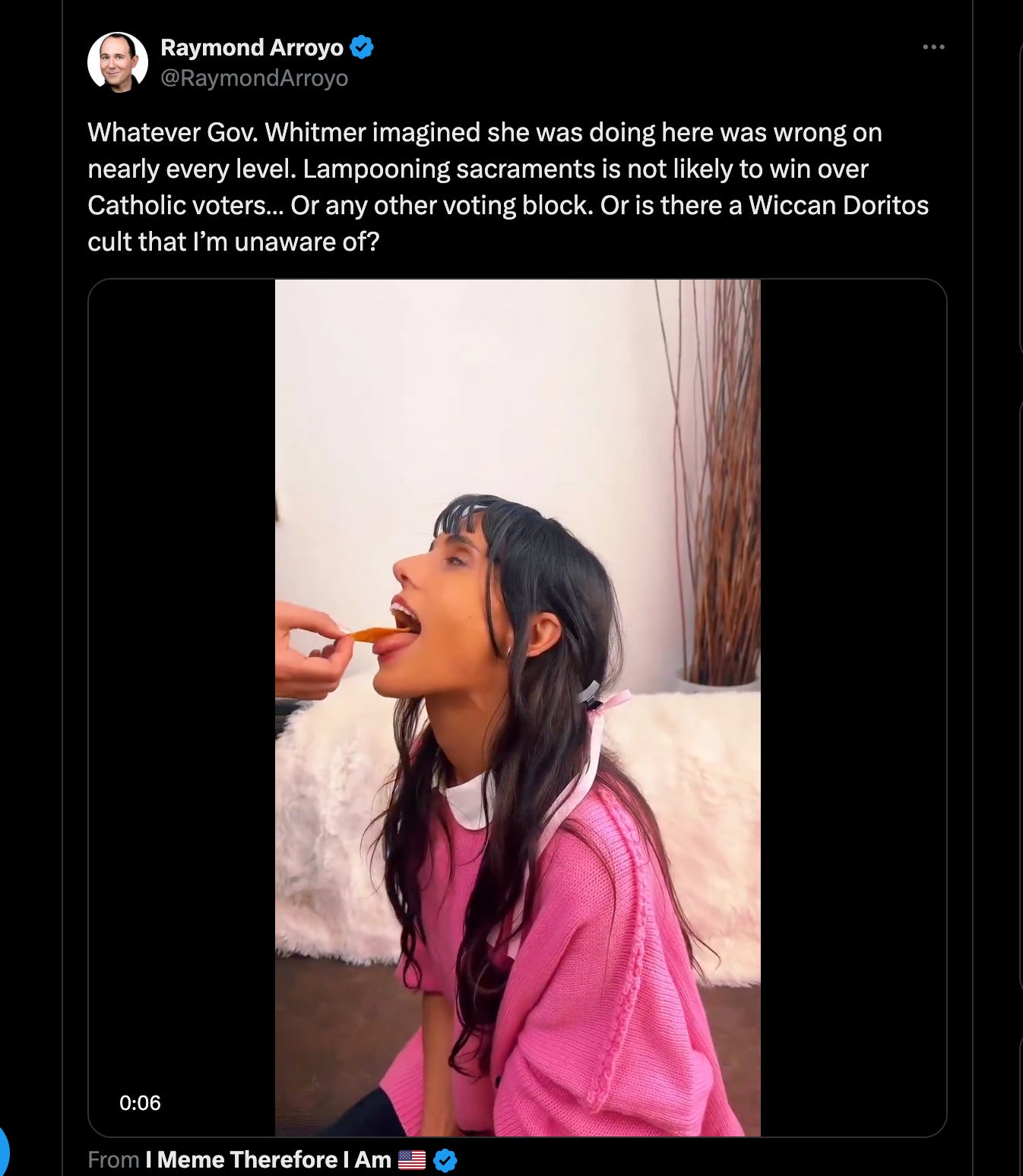 “Many Catholics are going to see this as mocking the communion rail,” Tim Graham, executive editor of NewsBusters, stressed on X. “Except Catholics don’t make it look like sensual.” “Let’s be clear what’s happening in this video,” Trump adviser Tim Murtaugh stressed on X. “Gov. Whitmer of Michigan is pretending to give communion to an leftist podcaster on her knees, using a Dorito as the Eucharist while wearing a Harris-Walz hat.”