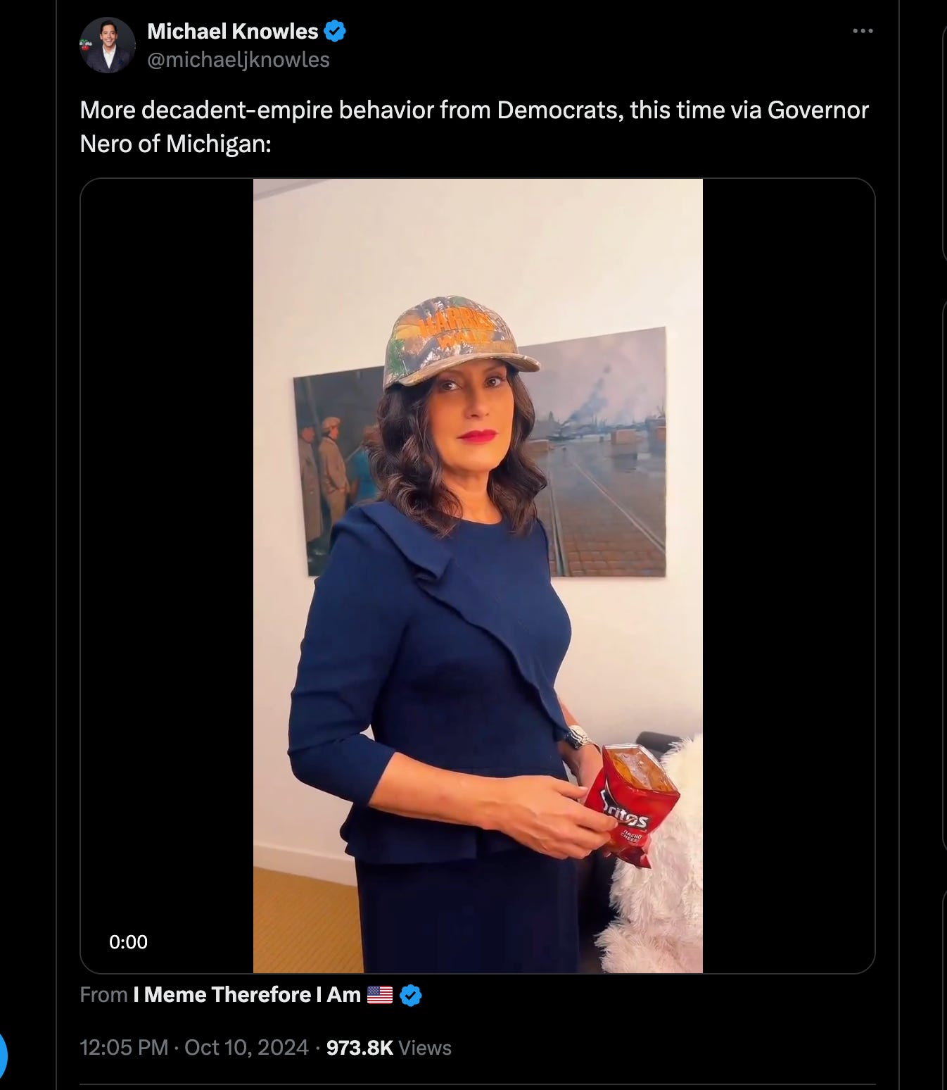 Michael Knowles, the little weenus from the Daily Wire whose only function in that company as far as we can see is to make Ben Shapiro feel tall, says this is “decadent-empire behavior” from “Governor Nero of Michigan.”