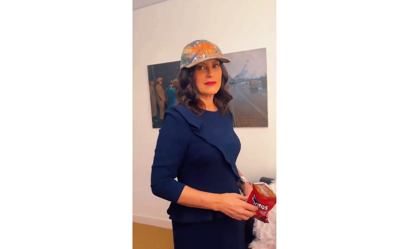 Here is a video of Gretch feeding a Dorito to a person, in some kind of way, while wearing a Harris/Walz camo hat, with musical accompaniment.