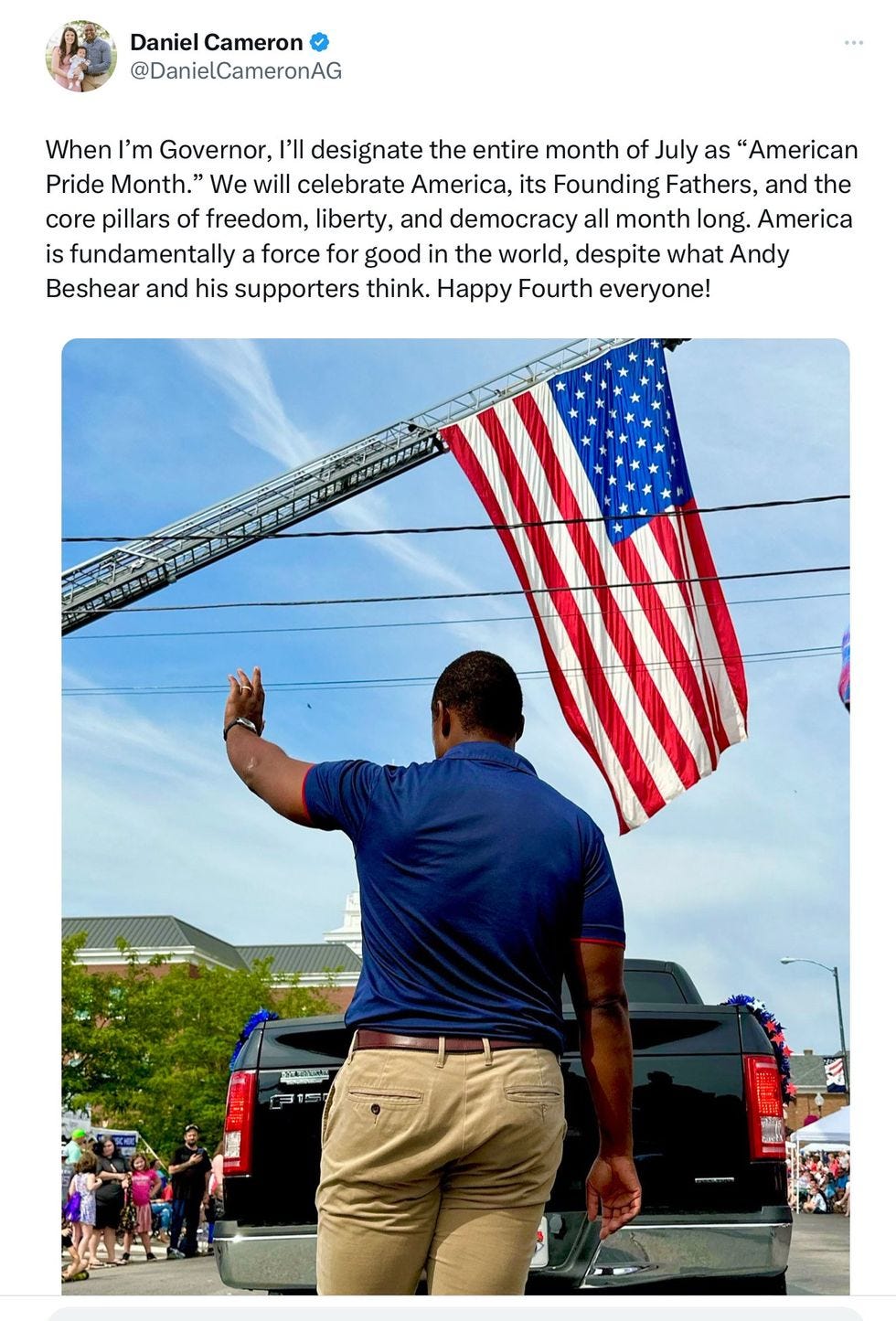Daniel Cameron, the sunken place-residing Republican nominee for Kentucky governor — it's an off-year election and coming right up! — commemorated the Fourth of July with the following tweeted message: “When I’m Governor, I’ll designate the entire month of July as ‘American Pride Month.’ We will celebrate America, its Founding Fathers, and the core pillars of freedom, liberty, and democracy all month long. America is fundamentally a force for good in the world, despite what Andy Beshear and his supporters think. Happy Fourth everyone!”