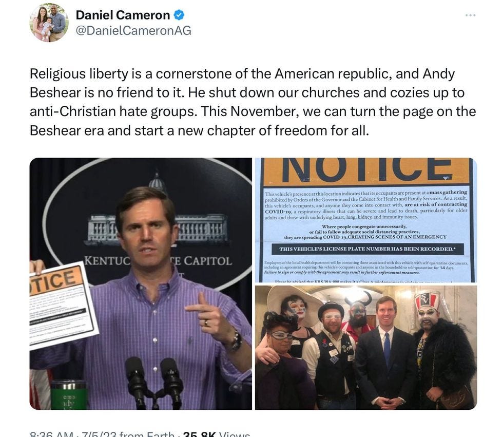 Wednesday, Cameron tweeted these libel-adjacent remarks, “Religious liberty is a cornerstone of the American republic, and Andy Beshear is no friend to it. He shut down our churches and cozies up to anti-Christian hate groups. This November, we can turn the page on the Beshear era and start a new chapter of freedom for all.”