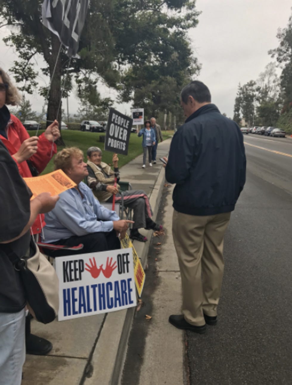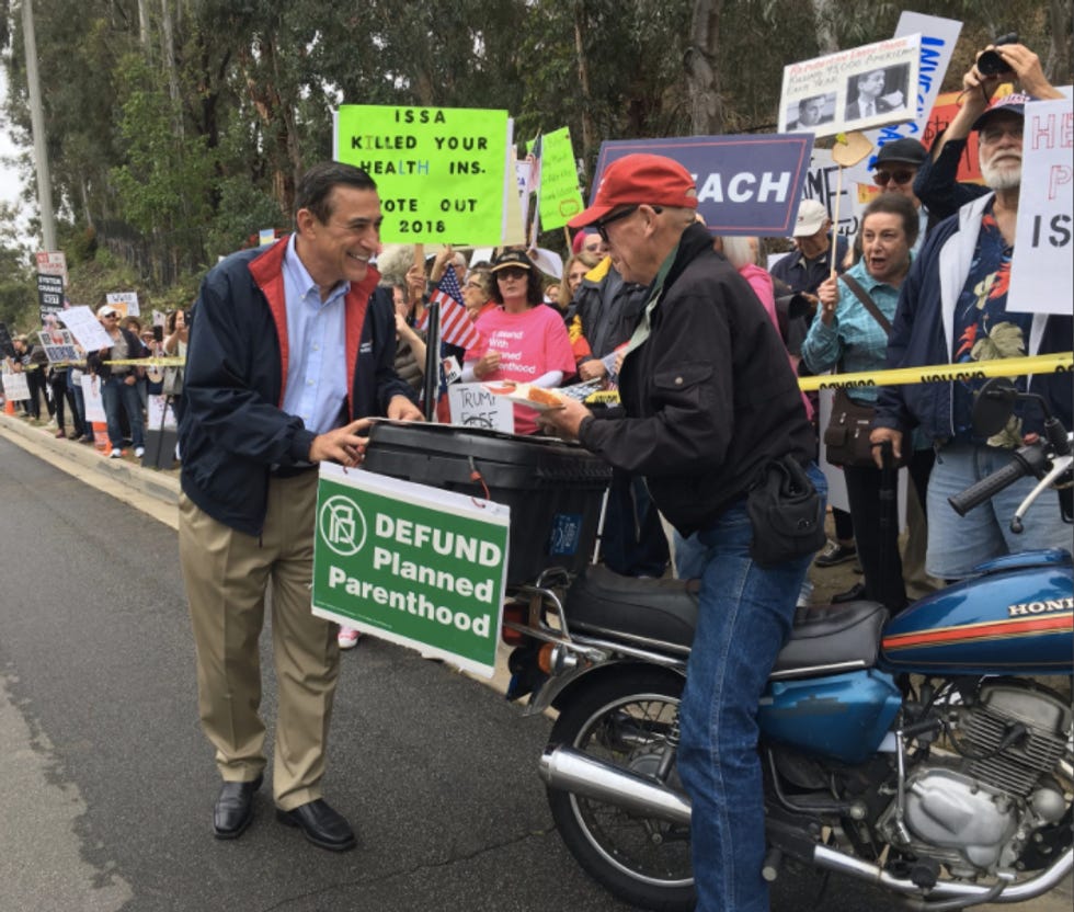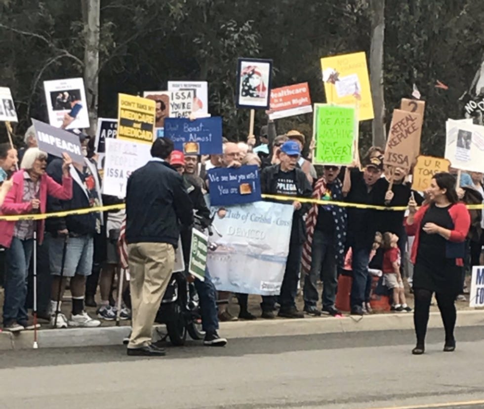 Montanari said Issa told her “step away, you are a protester” and that she replied “I am a constituent.” She said he then made “disparaging remarks” about the protesters and the signs they carry.