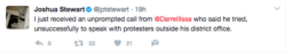Every Tuesday, 300-800 protesters converge on Issa's office to show their appreciation for Issa's brave vote to pass the Republicans' stinking turd of a healthcare plan. This week, the Congressman is home on recess preparing to host a town hall this Saturday -- which promises to be LIT!