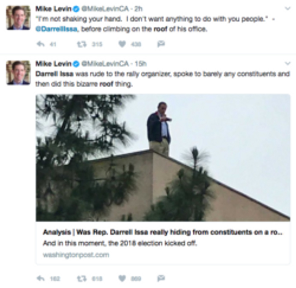 And then Mike Levin, the environmental attorney running against him in 2018, was OMG! SO MEAN on Twitter.