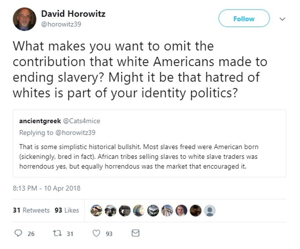 What happens to a dream deferred? Maybe it sags, like a heavy lode of bullshit? Does it go to Cal Berkeley in the '60s as a Lefty and mutate into a foul lynching apologist decades later? Just how does that work? Is Horowitz a damn shape-shifter? A transformer? Conservatives! Ra-cists in dis-guise! Not tryna hear his pseudo intellectualized trash sonata because guess who isn't Kizzy no mo'? Wannabe Massa Dave can kiss my black ass. We all know one when we see one, hear one, read one. Anyone that tweets "Lynchings were bad but they weren't mainly about whites yanking blacks off the streets and stringing them up" deserves to be on the SPLC "Most Wanted" poster (and his horrid goatee too!).
