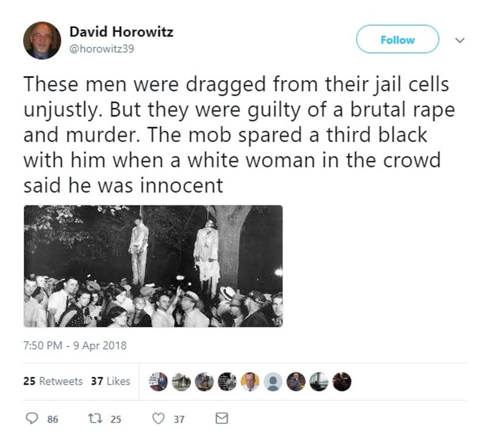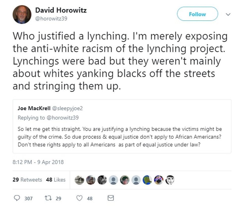 HIV/AIDS-mandatory-testing fuckboi David Horowitz strikes again. Nope, it wasn't enough that he chastised the military for responding to sexual abuses gone unpunished for far too long, opining that those poor career officers were being ruined by those ball breaking skirts in Congress in a white boy witch hunt! This time he's decided to give the strange fruit of our country's murderous Jim Crow history his special cracker ... erm, ahem ... crack-on perspective. After "60 Minutes" and Auntie O gave us a glimpse of the memorial for known lynched victims opening this spring, Breitbart juice drinker Horowitz proselytized that lefties are so reactionary! One-third of lynching victims were white people! It was just frontier justice, yo! Nothing to do with racism, like, At. All. Y'all. And who is the real racist? YOU KNOW THE ANSWER TO THAT.