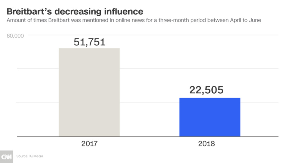 With Steve Bannon's forced departure after he said all those unkind thing about Donald Trump and others in that I Fired a Furry book earlier this year, nobody seems to think Dead Breitbart has much to distinguish it any more from any other burbling gas vent in the rightwing fever swamp. Readership is down, badly -- Politico reported in June the site's traffic had declined for seven straight months, a trend that began even before Bannon's ouster. Darcy, citing data from analytics company IQ Media, points out that the number of online news mentions of Breitbart this spring was less than half the rate in 2017, when Bannon was still getting called Trump's brain. SAD.