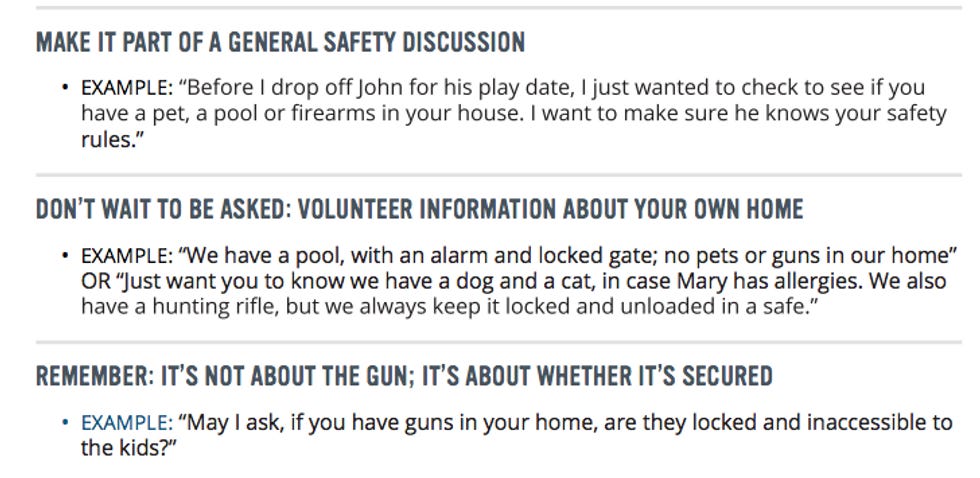 More than 28,000 children were shot with guns in 2016. Let us brainstorm some ways to politely ask if there are unsecured guns before letting your child visit with friends!