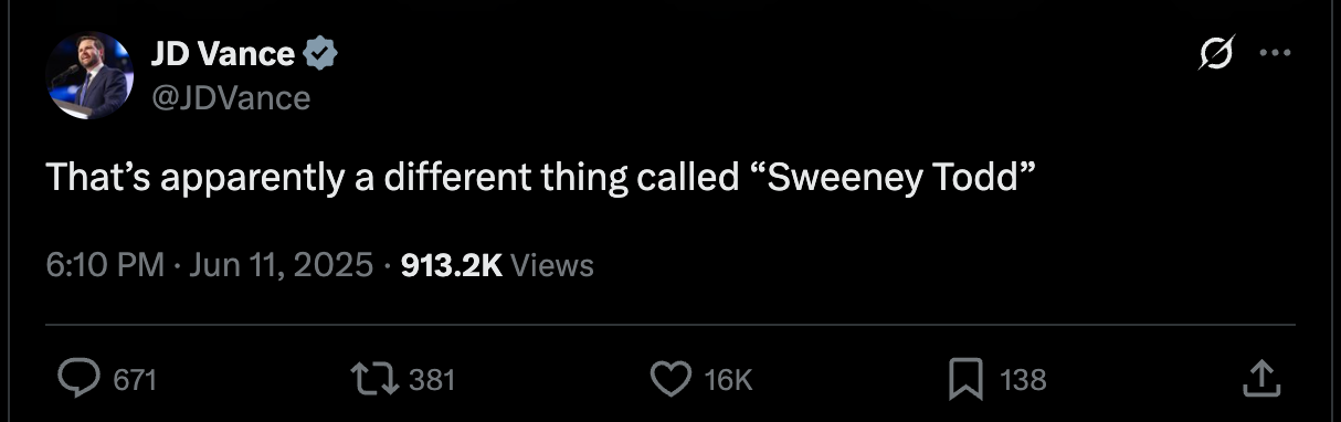 ![About to see Les Miserables with POTUS at the Kennedy Center. Me to Usha: so what’s this about? A barber who kills people? Usha; [hysterical laughter] About to see Les Miserables with POTUS at the Kennedy Center. Me to Usha: so what’s this about? A barber who kills people? Usha; [hysterical laughter]](https://substackcdn.com/image/fetch/$s_!iL_D!,w_1456,c_limit,f_auto,q_auto:good,fl_progressive:steep/https%3A%2F%2Fsubstack-post-media.s3.amazonaws.com%2Fpublic%2Fimages%2Ffb99ad58-2855-42d5-89d8-71545ff8ad4c_1214x598.png)