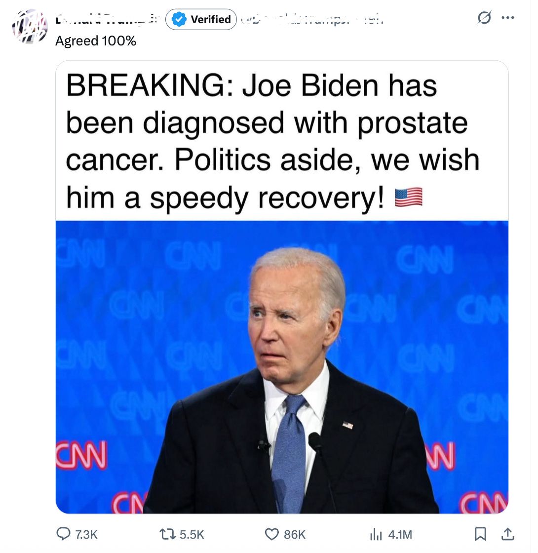 I mean, it’s clearly proof of something, isn’t it? And it may be rude, or “too soon,” but I worry that people are in danger of feeling badly for this cancer-having person instead of wildly speculating on what nefarious thing he is trying to get away with by having cancer or saying he had cancer at this particular time. It is especially important for me to get everyone to be fully on board with my belief that this person — while personally orchestrating every evil thing in the world, including raising the prices of groceries with the power of his mind — has had dementia for many years and that this is part of the cover-up. Somehow.