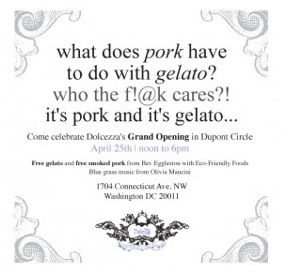 There is no relationship between gelato and pork other than the fact that everyone out there who supports locally grown whatever is also obsessed with eating pig. Well, as eating pig is simply the newest Yuppie endeavor, at the Sunday grand opening Dolcezza will be serving meat from a 350 pound pig, courtesy of EcoFriendly Farms, that will have been roasting for 24 glorious hours. Oh yes, the gelato, that too will be free at the opening, which will also feature live bluegrass music.