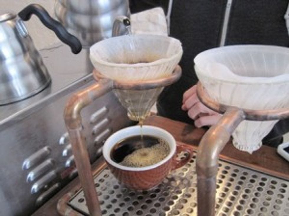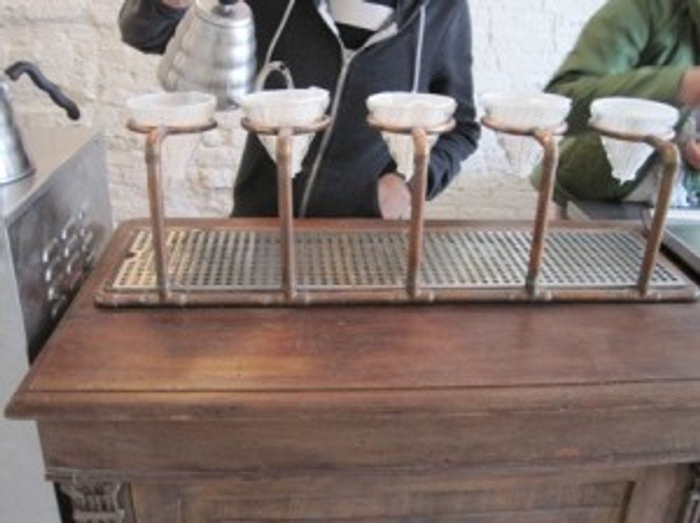 This fancy contraption is a V60 coffee bar. It's latest in pour-over technology-- pour-over being the only way to brew coffee, as the Dupont Circle crowd doesn't do plain drip. The V60, you see, makes the coffee brewing experience more personal, and it works as such: You choose coffee beans from your favorite country (right now there are beans from Ethiopia, El Salvador, Kenya and Columbia), they grind them, pour them into the thing, add water in 30 second intervals, and viola, a cup of coffee brewed just for YOU!