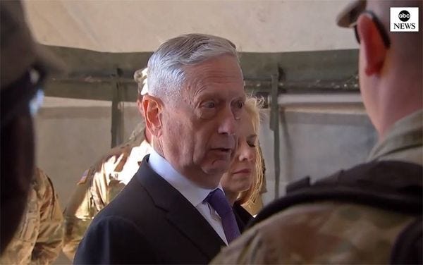 But some questions were a bit more tricky, prompting very strategic non-answers from Mattis. One soldier asked what the short-term and long-term goals of the mission are. You might think they'd been briefed on that by now -- maybe the soldier was checking to see if Mattis had been briefed!