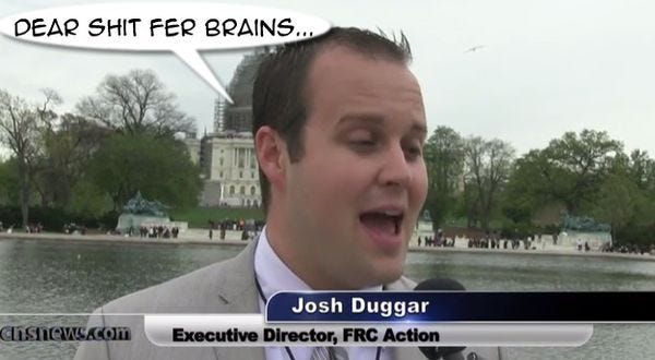 The bestest defense of Josh Duggar's sister-molesting, of course, came from folks who simply wanted to point out that no one who does, condones, or fails to condemn buttsex has any moral standing to condemn Josh Duggar -- although apparently people who write long comments in which they obsess about P-E-N-I-S in the ANUS are exempt from that rule.