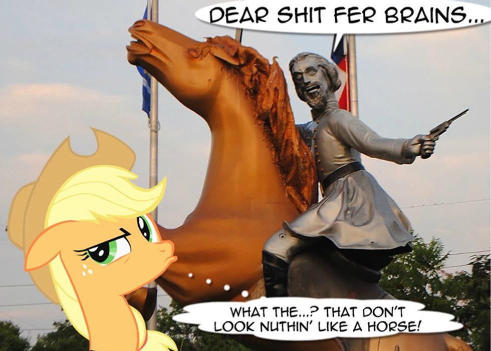 We suppose we could counter-nitpick, like pointing out that we never claimed Forrest founded the KKK -- he was, however, its first Grand Wizard, and later in life rejected his racist views, as we acknowledged in the very Dear ShitFerBrains column that dealt with the first wave of comments about the statue. However, as we noted at the time: