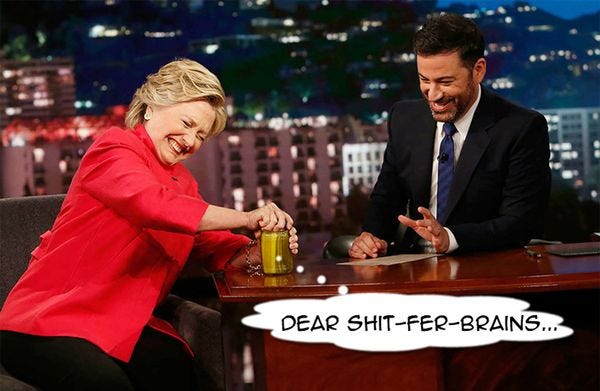 We had quite an impressive pile of deletia this week, about two thirds of which were from one really verbose guy who wrote nine million comments about why Republicans are all rich like him, and Democrats are not. Not one of 'em was worth quoting. Some of the most strangely insistent posts were from Hillary Clinton Pickle Truthers, who knew, JUST KNEW that the whole jar-of-pickles farce on the Jimmy Kimmel Show was not really proof of Hillary Clinton's health, and besides, that jar of pickles had already been opened!!!!!!! Which kind of misses the point that it was a comedy bit and nothing more. Nay, the sad reality is that Hillary Clinton is simultaneously on death's door AND an enormous threat to freedom and world peace -- at least if she manages to outlive William Henry Harrison once in office. Bundle up for that inauguration, Hillz.