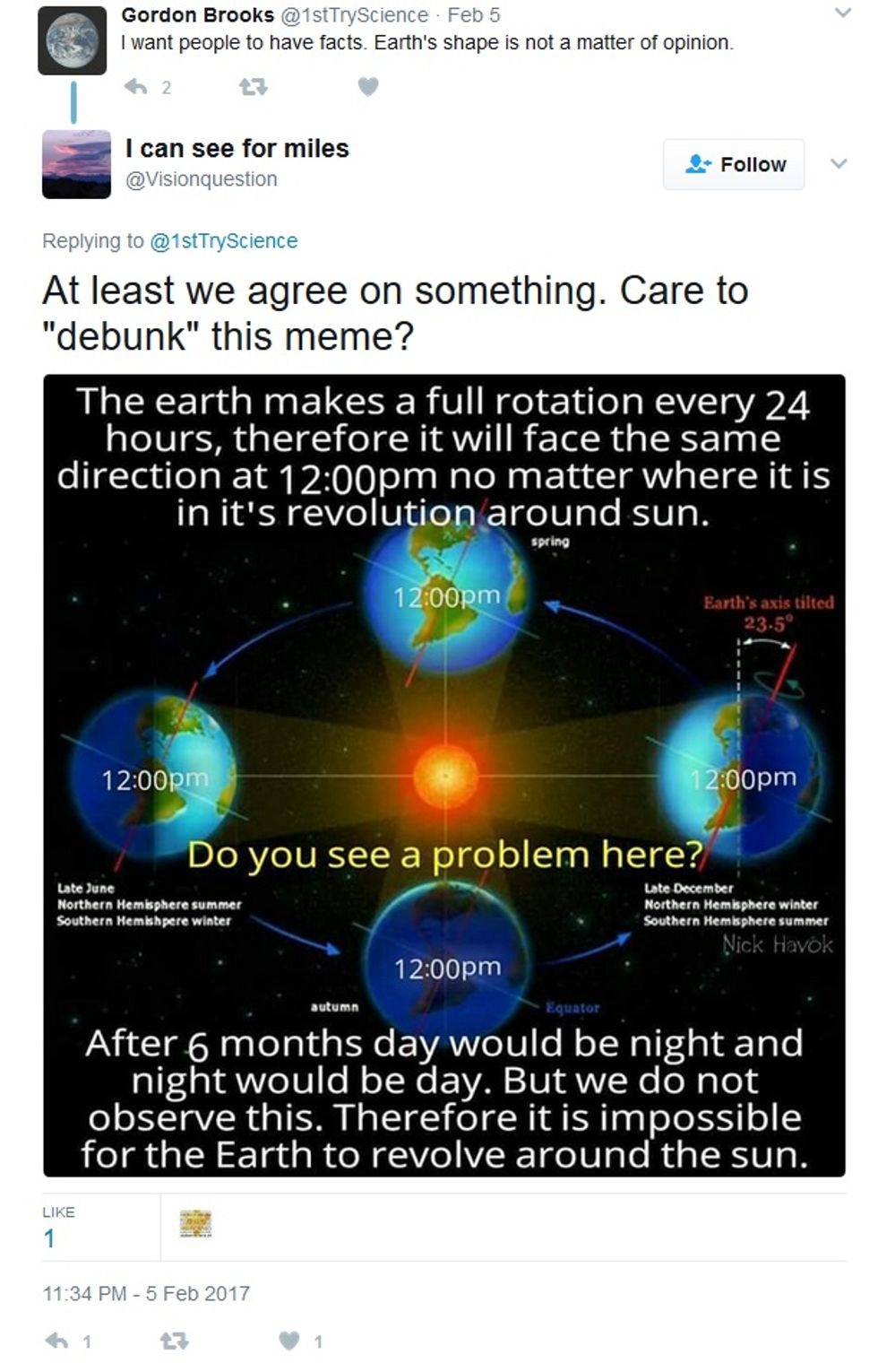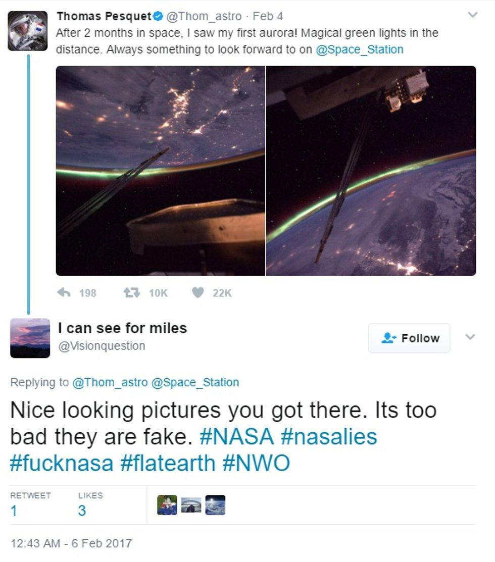 Ah, but then we discovered "Visionquestion's" Twitter feed, which is a veritable buffet of crank magnetism. If you've got a conspiracy theory, then "Visionquestion" is IN! Their own Tweets are mostly Flat-Earth stuff, like yelling at astronauts about the shitty fake "round earth" backdrops in their shitty fake photos from the shitty fake "space station":