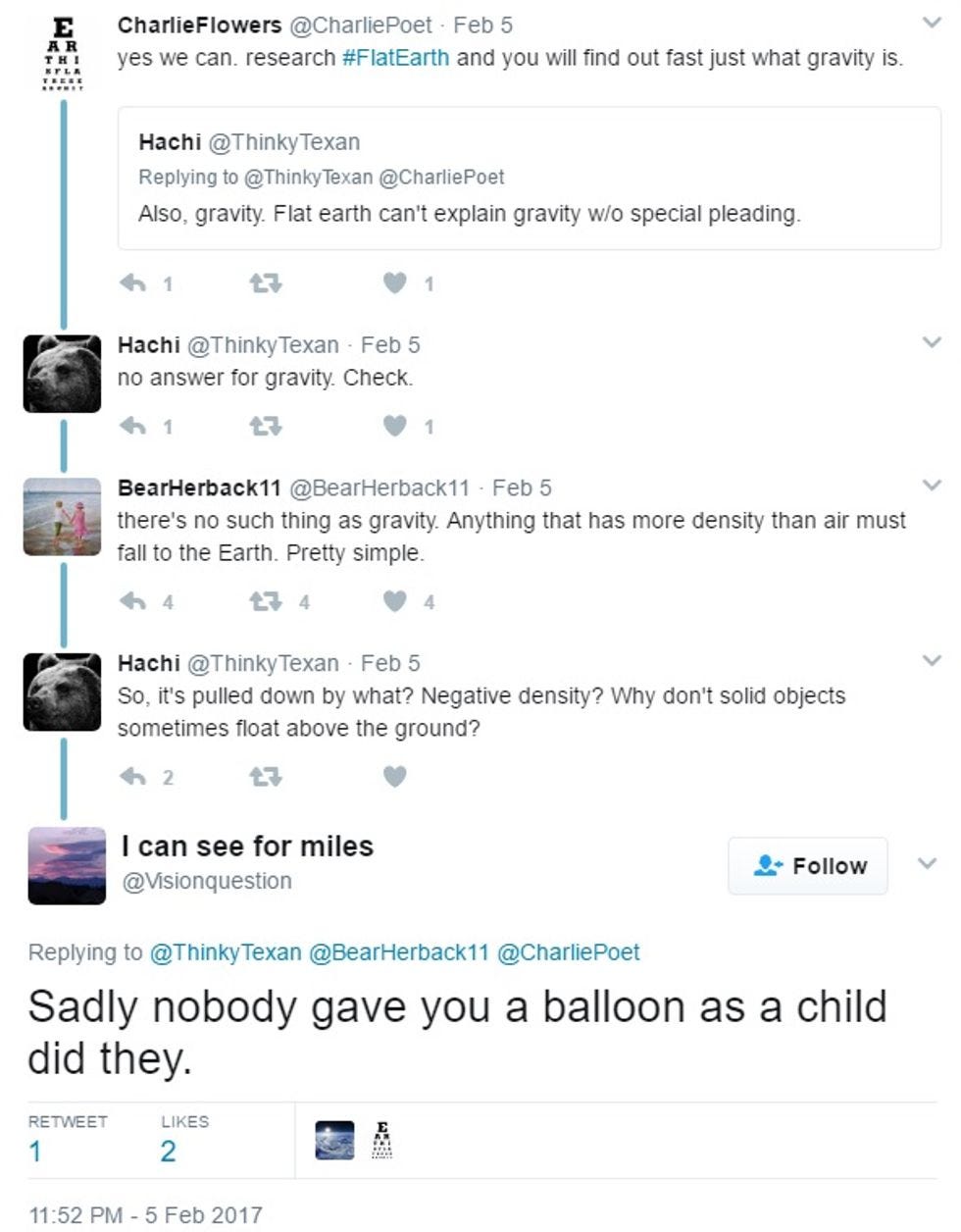That last line -- obviously they meant "I was like you once" -- is a nice dangling mystery. Was "Visionquestion" going to explain what opened their eyes to the New World Order and its nefarious agenda of promoting the model of Earth as an oblate spheroid? What exactly IS the NWO getting out of hiding the truth of the Flat Earth? And why doesn't "Visionquestion" already know Yr Editrix is a member of the International Jewish conspiracy herself? So many mysteries!
