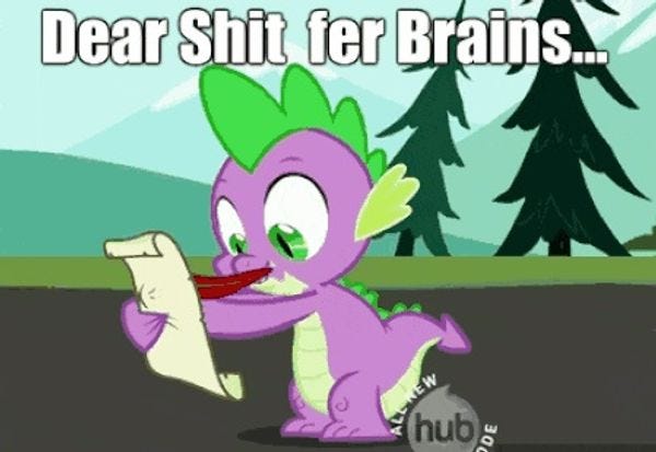 When some libtart pointed out that he'd sound a whole lot smarter if he could remember the difference between your and you're, he dismissed that as a "common typo when typing quickly" (and therefore irrelevant), urged us all to "Educate yourself on what the government doesn't spoon feed you you dumb SCROTUM. Yeahhhhh!!!" and explained that we would never dare talk to him in public the way we do on this libtarted blog: