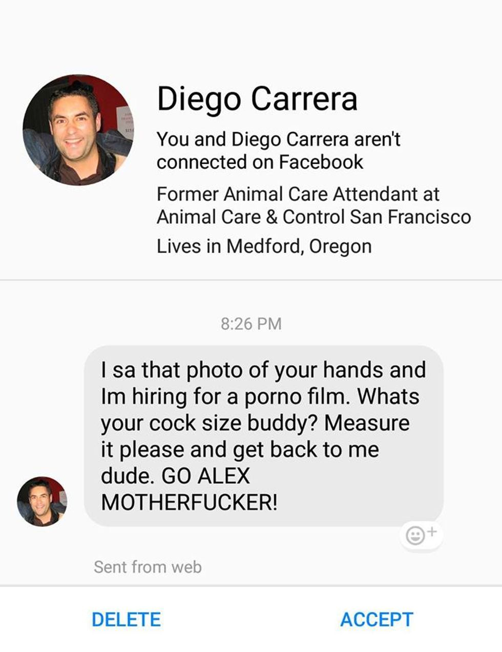 Diego Carrera, an Alex Jones fan in Medford, Oregon was so distraught that anyone would dare say anything mean about his hero that he spent his Friday night going through the trouble of tracking Robyn down on Facebook and commenting on her photos. He even sent her this beautiful and thoughtful note!