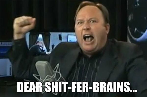 We heard from some Serious Thinkers with some Serious Thoughts this week, and once we hosed off our boots and took a nice Silkwood shower, we're delighted to share them with you, the discerning Wonkette reader. Let's get right into the weirdness with some thoughts from "AZCardsFan85," who wanted us to know that while Jones is maybe sometimes a bit loopy, as with his recent rant in which he explained Michelle Obama is actually a dude, Mr. Jones is, in fact, not always completely wrong: