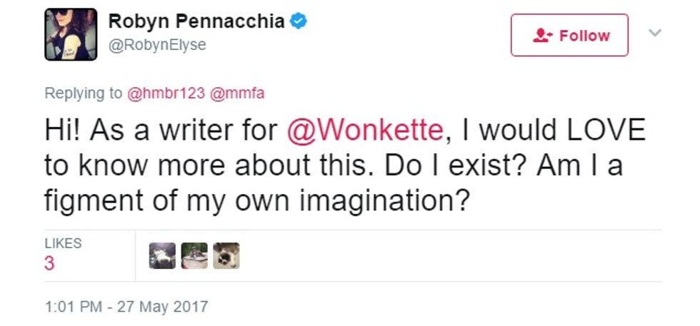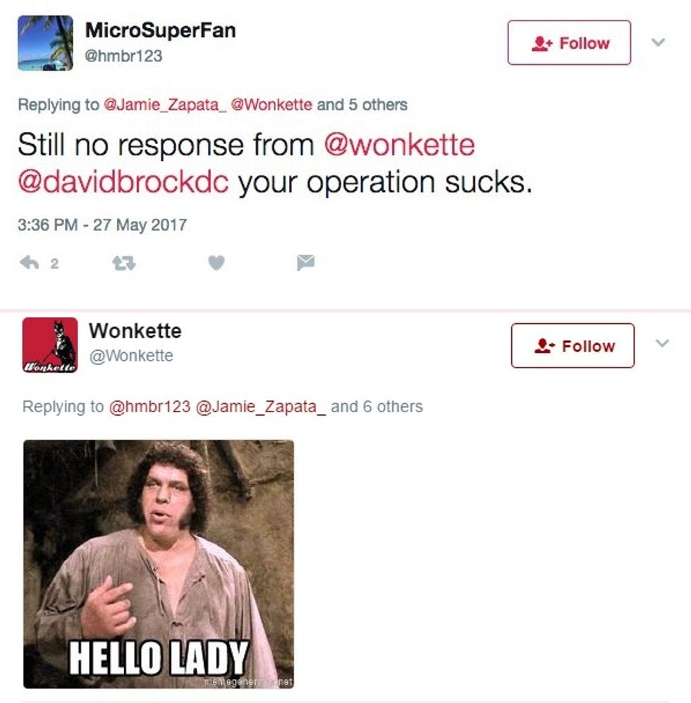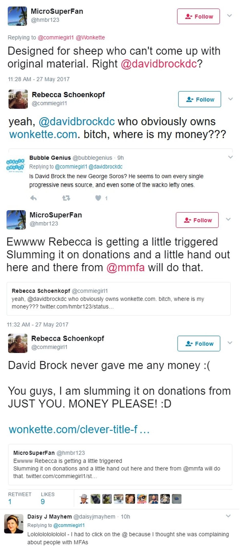 Yr Editrix wondered where the money from MMFA owner David Brock was, and "MicroSuperFan" proclaimed victory, because she'd clearly triggered Rebecca, blah blah safe space, blah blah snowflake. At least Rebecca remembered to ask for money, because that's just how destroyed she was by all the triggering: