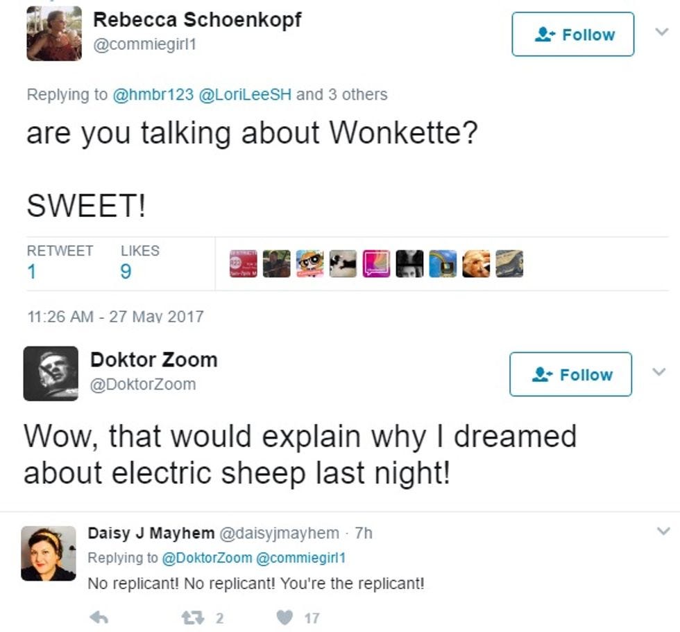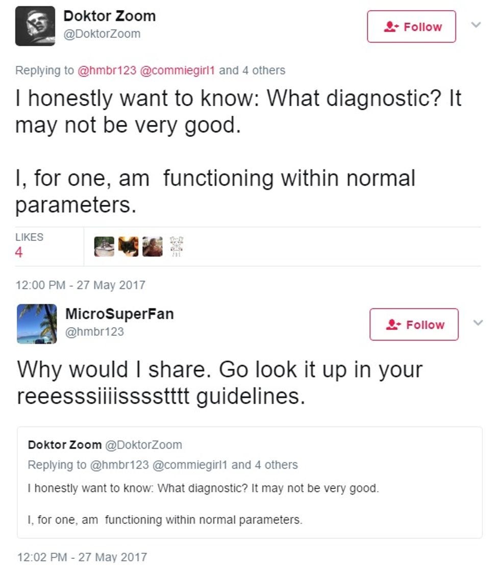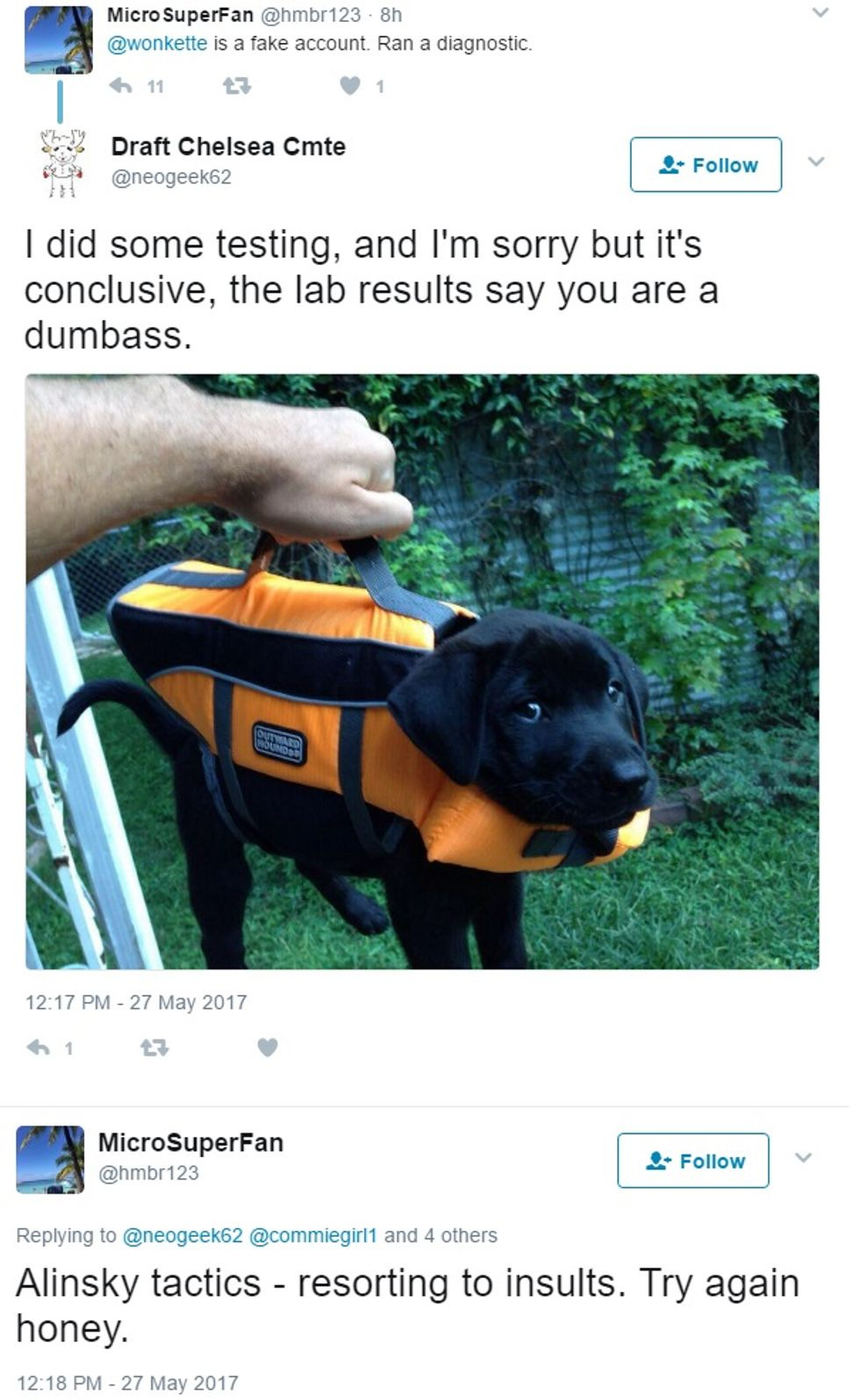 Sigh. Before long, virtually anyone who'd interacted with MicrocephalicSuperFluff was blocked, which made retrieving some parts of the conversation difficult. But believe us, we've seen Tweets you people wouldn't believe. Flaming flying monkey brigades off the shoulder of Orion. We've watched C-level trolls sputter in the dark near the Trumphäuser Gate. All those moments will be lost in time, like farts in the wind. Time to delete your account.