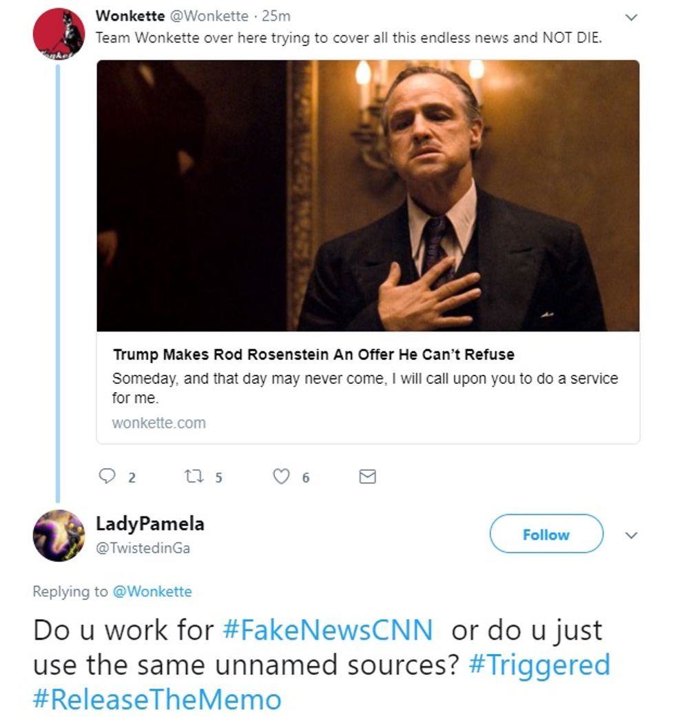 Out on the electric Twitter machine, "LadyPamela" was seriously cheesed about our piece on Donald Trump's fears thatRod Rosenstein might not be on his team. "LadyPamela" was not pleased: