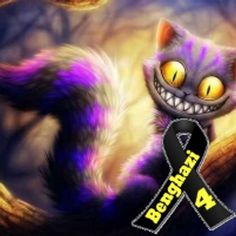 "LadyPamela's" Twitter bio, we are sorry to report, does appear to be just a tiny bit trollish. It's got this charming picture commemorating the "Benghazi 4" somehow, with a weird leering Cheshire cat (maybe it's Hillary's familiar? Because she is a witch you know) and this inspiring text: