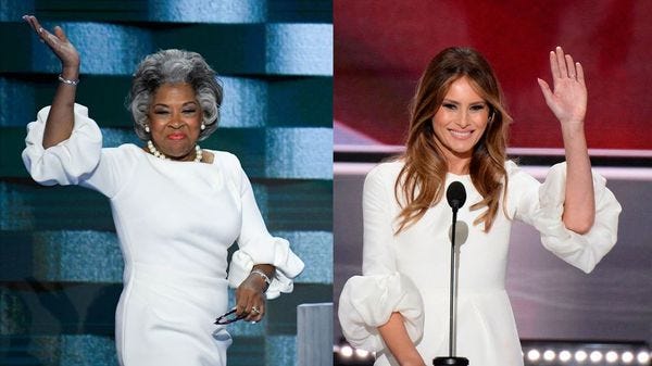 As you will see in the main picture, Rep. Joyce Beatty of Ohio went ahead and plagiarized Melania Trump's dress. Has anything, ever, been more perfect? I confess I was hoping Michelle Obama would deliver her entire speech in a Slovenian accent with a totally straight face, but this was way, way better than that. JOYCE BEATTY FOR PRESIDENT OF MY HEART.