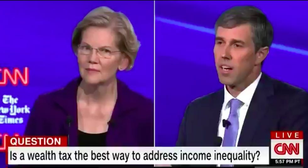 Beto O'Rourke accused Warren of pitting Americans against each other. He said she was too focused on being "punitive," as if she's going to tax "naughty" billionaires with a whip. This isn't even new material. It's the "class warfare" jargon Republicans used against Barack Obama. The brother asked rich people so nicely to maybe pay a little more in taxes and they behaved like sullen teenagers asked to clean up after dinner: "WHY DO I HAVE TO DO EVERYTHING AROUND HERE! I HATE YOU!"