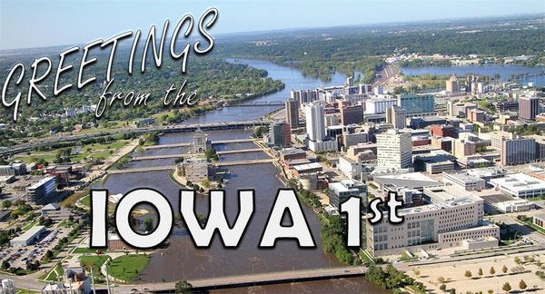 Iowa is divided into four haphazard corners, with the First resting in the northeastern quadrant. It's littered with random bits of forgotten midwestern Americana like "Snake Alley," baseball legends, the Decorah crater, and the hills of Dubuque. Most of the places not already claimed by Native Americans seem to have been named by unimaginative pioneers who stuck "city" or "town" at the end of a noun.