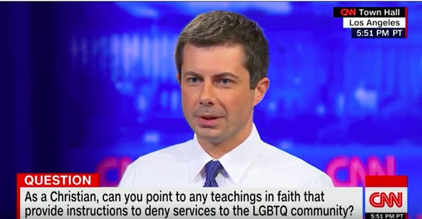 BUTTIGIEG: Without telling others how to worship, the Christian tradition that I belong to instructs me to identify with the marginalized and the greatest thing that any of us has to offer is love. Religious liberty is an important principle in this country and we honor that. It's the case that any freedom that we honor in this country has limits when it comes to harming other people.