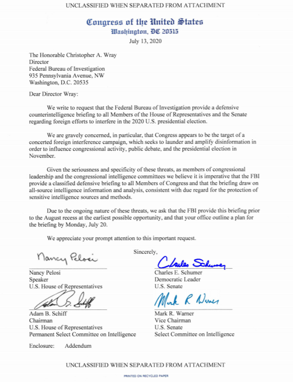 We write to request that the Federal Bureau of Investigation provide a defensive counterintelligence briefing to all Members of the House of Representatives and the Senate regarding foreign efforts to interfere in the 2020 U.S. presidential election.