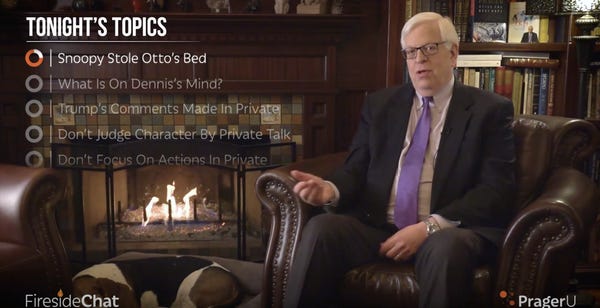 Now, it's 2020. Trump is impeached. Yet the injustice of Trump's first of so very many bad news cycles is still fresh in Prager's mind. He declared this week during a "fireside chat," while in the presence of an innocent beagle, that we shouldn't care what people say in the privacy of an "Access Hollywood" bus.