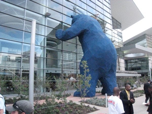 What's with the giant blue bear outside the Colorado Convention Center, anyway? Why is he doing the "paws up, bear trash" thing against the glass wall? According to the artist, the monster mutant is just, you know, looking into the convention center like some awful blue Peeping Tom street masturbator. It's a commentary on the lousy stock market or something. [ 9News ]