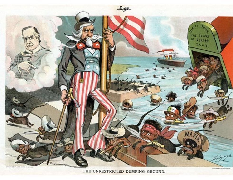 Now, I don't like it when anyone is horrible and unwelcoming to immigrants, but I really do find it particularly insidious when Italian-Americans are horrible and unwelcoming to immigrants. In fact, I believe that we have a special obligation to be their champions. We were, without question, one of the least popular immigrant groups of all time. Absolutely no one was happy to see our great-grandparents, who they thought were superstitious, criminal, hypersexual, left-wing radicals who would never be able to assimilate into US society.