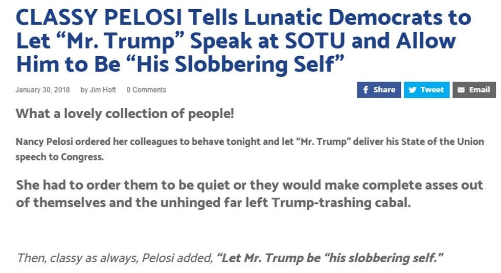 Needless to say, the Usual Idiots are already clutching their fainting salts and smelling their pearls over Pelosi's terribly uncivil way of calling for good behavior. Here's the Stupidest Man on the Internet, Gateway Pundit's Jim Hoft, who is simply aghast at the nassty Pelosi, he hates her, hates her!