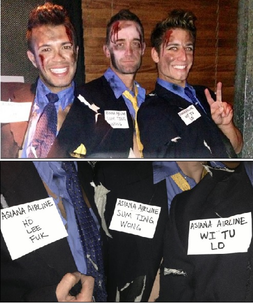 And then there's Dumb Yellowface, too; three white dudes dressed as dead-or-injured Asiana flight attendants, with the "hilarious" fake names from that San Francisco Teevee Station that got pranked:
