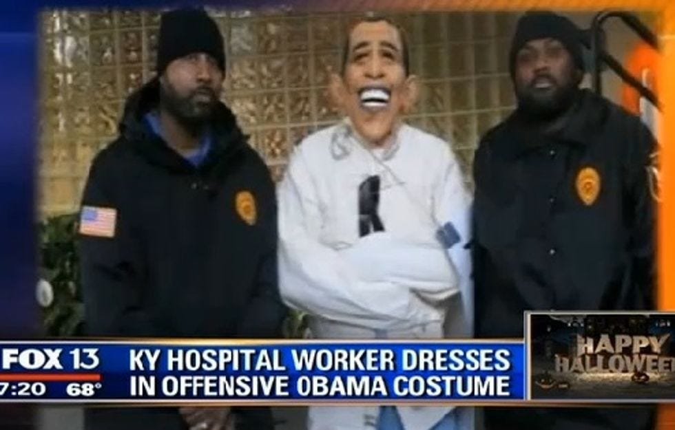 We're not sure about "Too soon" on this, but we're a little more sure of the "too racist" call.And this next one, we're not as bothered by, since, hey, person in Obama mask but not acting like a minstrel show, not so much a problem. In Hopkinsville, Kentucky, three guys portrayed Barack Obama in a straitjacket being escorted by security guards, and took third prize in a costume contest.