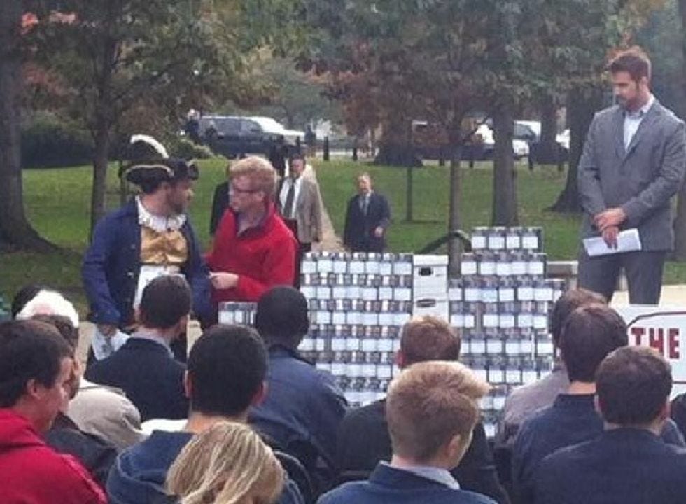 This morning, Slate's Dave Weigel tweeted a photoof a "Dude in pirate costume being asked to leave launch event for Fix the Debt’s millennial affiliate group." We've cropped it to focus on the costume guy; but is he a Halloween Pirate or a Tea Party Patriot? Is that a hook on his hand? Enhance!