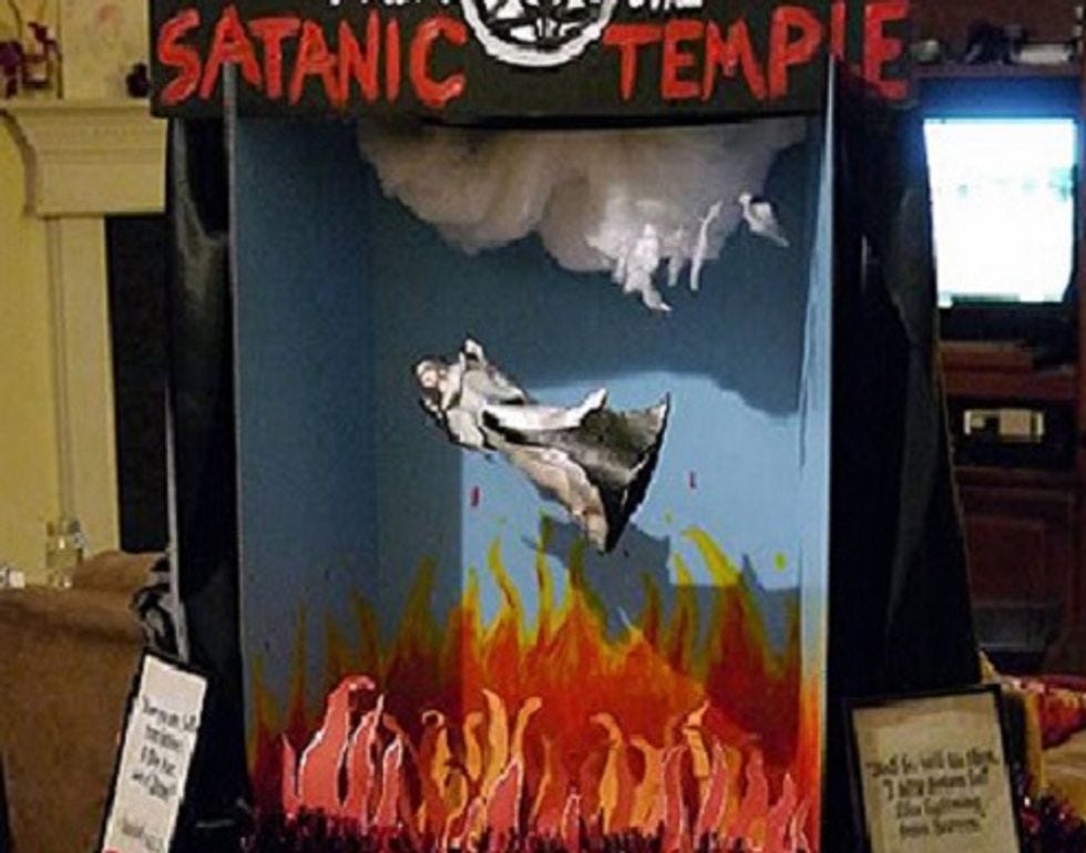 The 5-foot-by-5-foot poster the Satanists hoped to display showed an angel falling into hell along with a message reading, “Happy holidays from the Satanic Temple.”