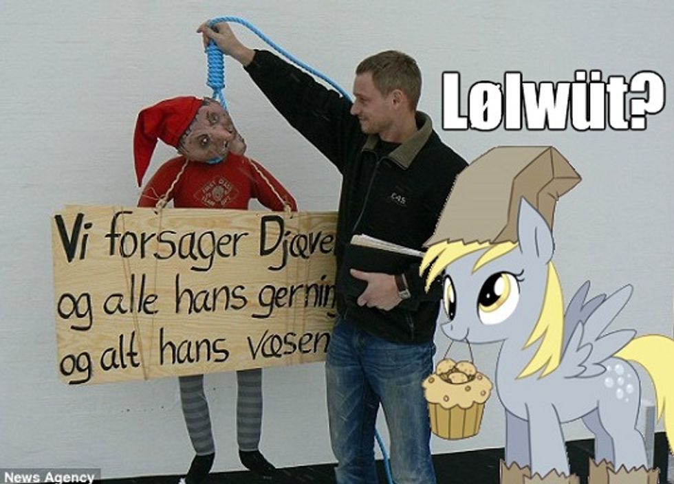 The elf held a sign saying "We renounce the Devil and all his deeds and all his being." Knudsen believes that elves represent demonic spirits from Scandinavia's pre-Christian past, and executed the little toymaker (or dentist) to remind people that elves and Christmas do not mix. We respect his effort to keep fictional worlds from colliding, but as fanboys, we have no real problem with crossovers, as long as they're well done, like that one fanfic where Twilight Sparkle ends up teleporting into Hogwarts. Rev. Knudsen's efforts at elficide were subverted by local pranksters -- trolls, as it were -- who left garden gnomes around the pastor's house and kidnapped the elf and left a note saying it would be returned after the new year. The elfnapper turned himself in, but Vendsyssel police did not press charges, saying their "caseload was too heavy to make investigating theft of a stuffed toy elf a priority.” In America, we're pretty sure someone would have ended up getting shot.