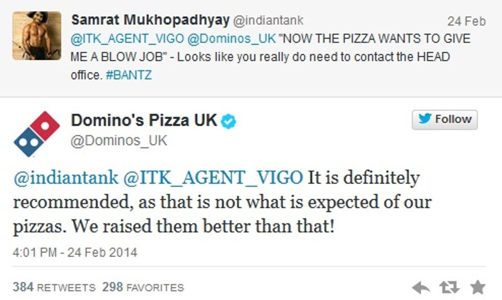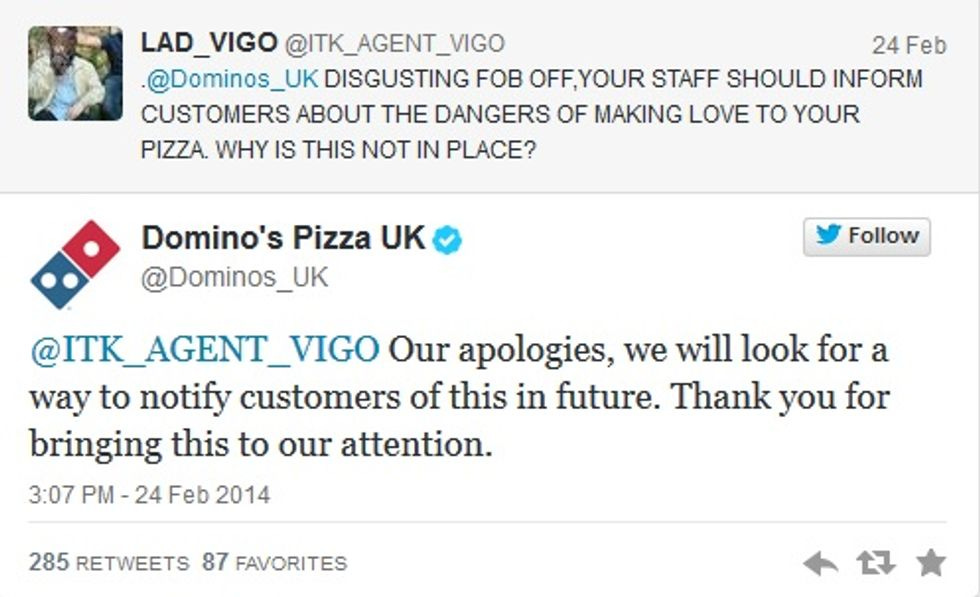Honestly, we do not carethat there was no man-on-pie sex, because of the perfectly brilliant string of replies from the corporate twitter account at Domino's Pizza UK, which started with the form-lettery-blowoff "Please contact our head office -- comments@dominos.co.uk regarding this matter" and then, as the troll started getting sillier, kept pace: