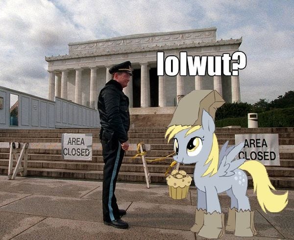 Welcome to a Gummint Shutdown Edition of the Derp Roundup, your weekly accumulation of asinine asshattery from the aether that was too stoopid to ignore completely but that we weren't inclined to waste a full-length post on. To start off, let's do a little bit of mythbusting! We caught Tucker Carlson's Home for Lying Liars in a bit of a lie! On Wednesday, the Daily Caller proclaimed, based on a single photograph apparently, that Washington DC's monuments and memorials were all kept open during the 1995/96 shutdowns: