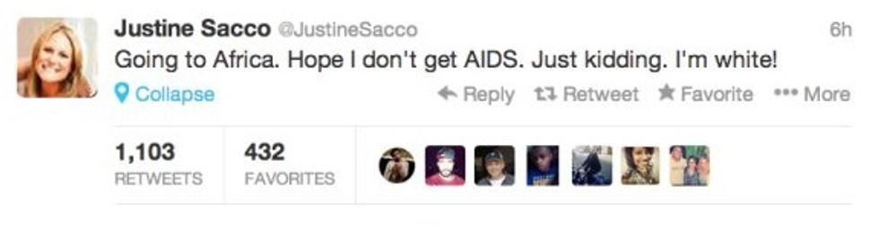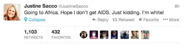 A charming lady named Justine Sacco, head of communications for internet company IAC, which owns sites like The Daily Beast, College Humor, and Vimeo, was flying from London to Cape Town when she decided to make use of the inflight wifi amenities and share a hilarious jokewith the world: