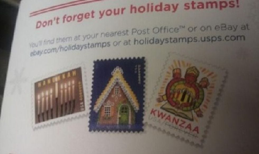 And finally, in another squirmish in the War On Christmas, wingnuts went into Freakout Level Eleventy over this photo of a U.S. Postal Service flyer advertising holiday stamps: