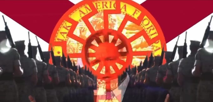 The governor’s face within a Sonnenrad, a very old symbol absolutely beloved of Nazis and white supremacists. (It means “sun wheel.”)