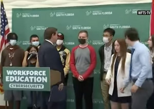 During a press conference this week, Ronald Dion DeSantis, governor of Florida, decided to berate some high school kids whose job it was to stand behind him while he said whatever it is he wanted to say about "workforce education." Why? They were wearing masks and this made him unhappy.