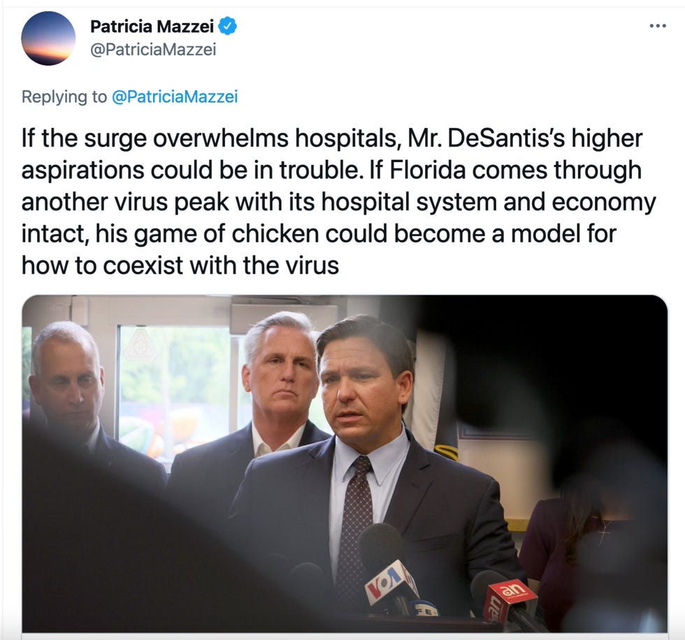 This weekend, the New York Times published one of the most appalling articles we've seen since ... well, we haven't checked this morning's headlines yet. The COVID-19 Delta variant is currently ravaging Florida, thanks almost entirely to Republican Governor Ron DeSantis's malicious, ego-driven stupidity. Yet, this is how the Times 's Miami bureau chief, Patricia Mazzei, frames the issue.